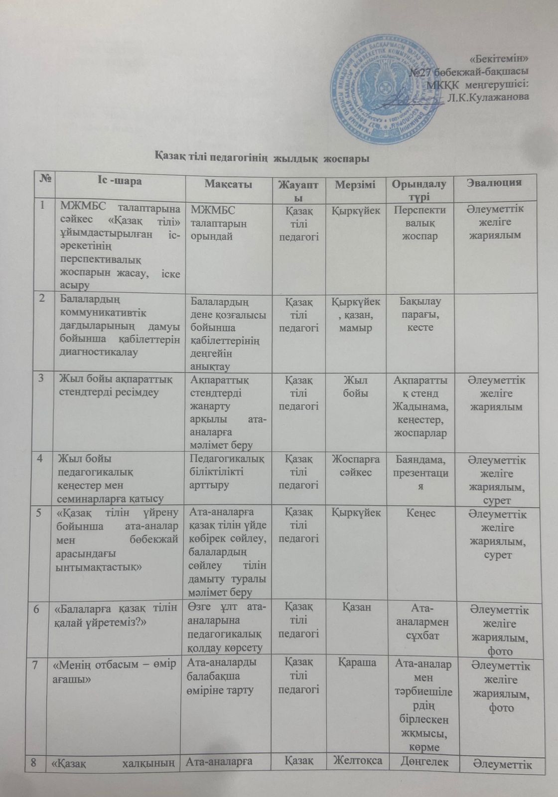 2025-2026 жылға арналған жылдық жоспар » №27 бөбекжай-бақшасы